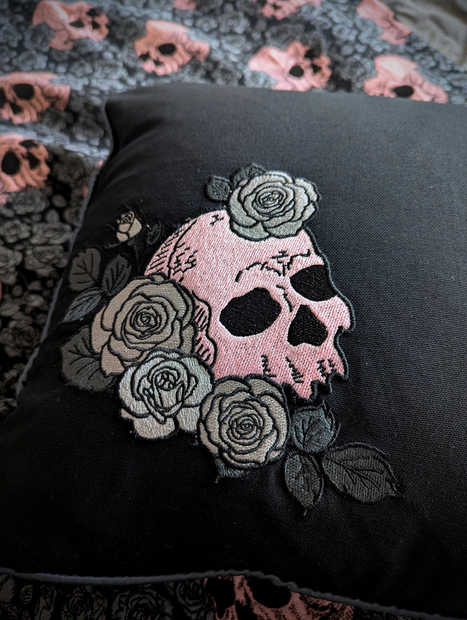 This cushion is made from a quality black cotton canvas fabric with an embroidered pink skull nestled amongst grey roses and foliage.