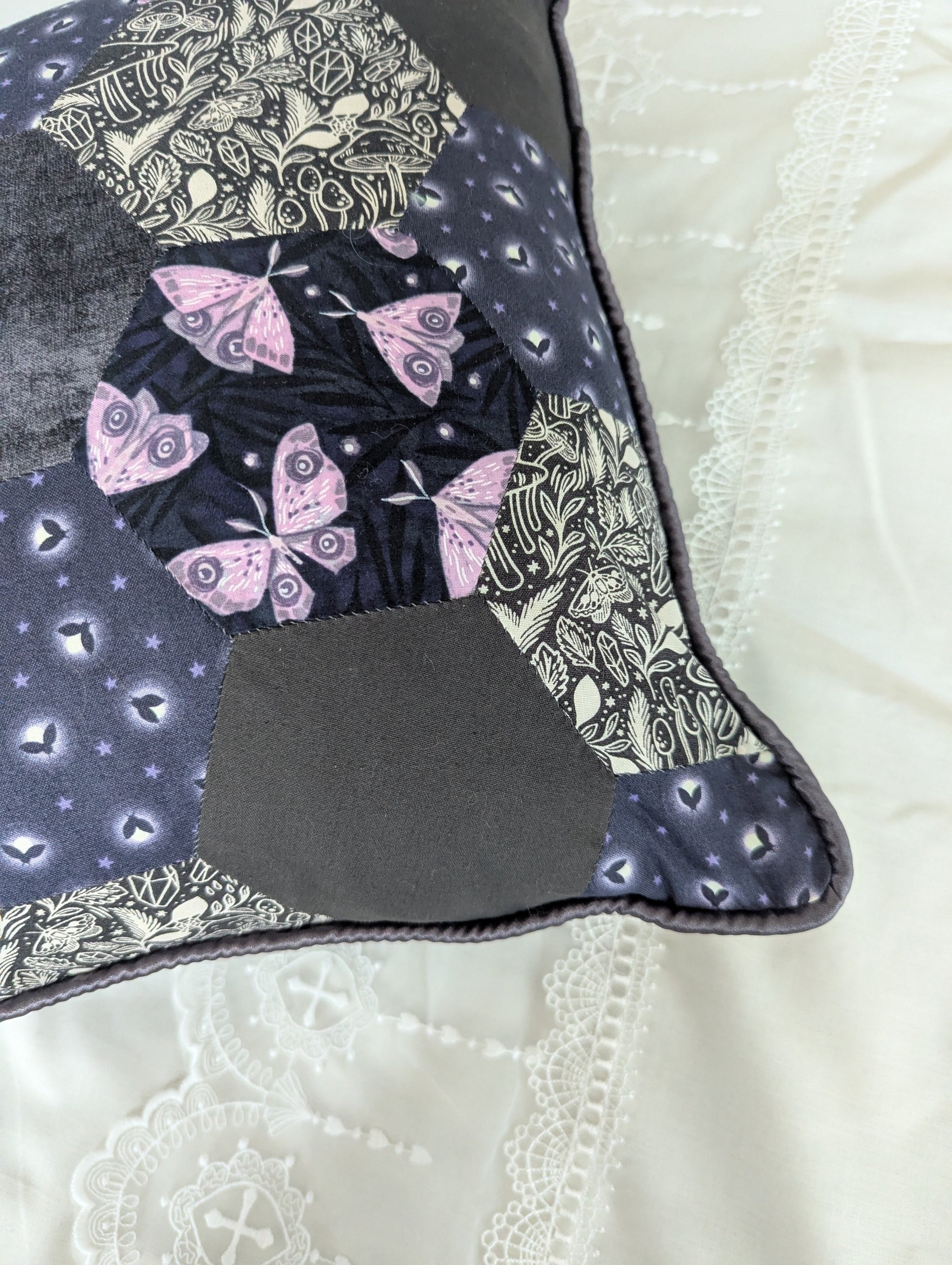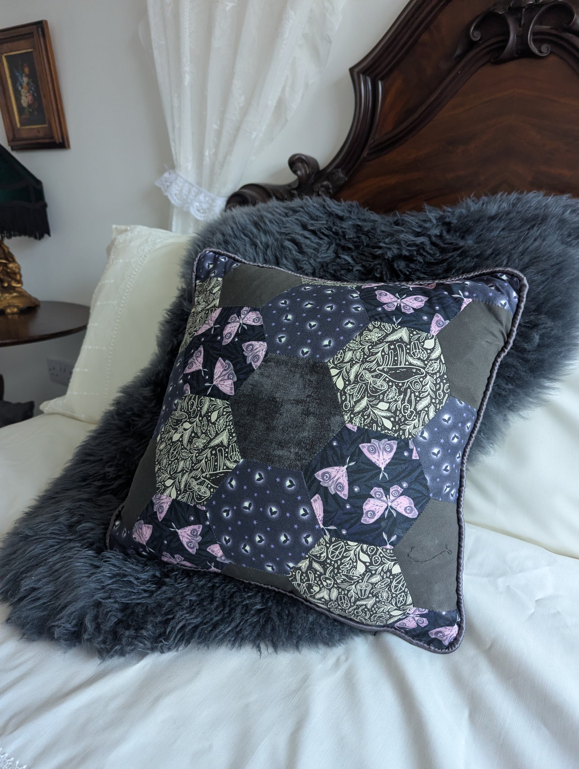 The front is made of hexagon pieces featuring moths, fireflies, mushrooms and crystals, which have been sewn together by hand. It has then been piped in silver grey satin and finished with a quality grey cotton back.