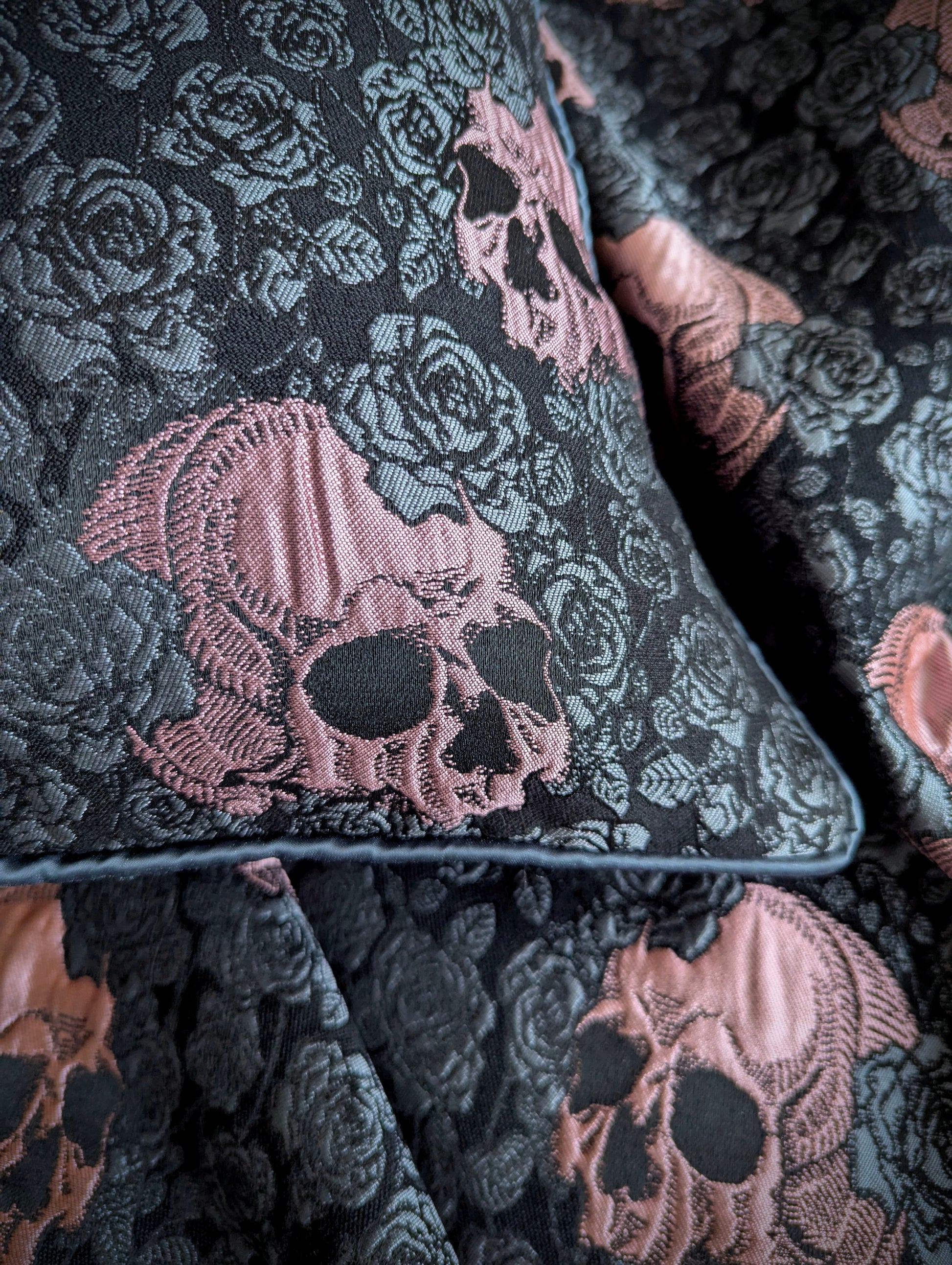 This cushion is made from a beautiful woven jacquard fabric that features soft pink anatomical skulls amongst grey roses on a black background. The fabric has a lovely silky sheen to it, making this cushion a luxurious addition to your bed or sofa.